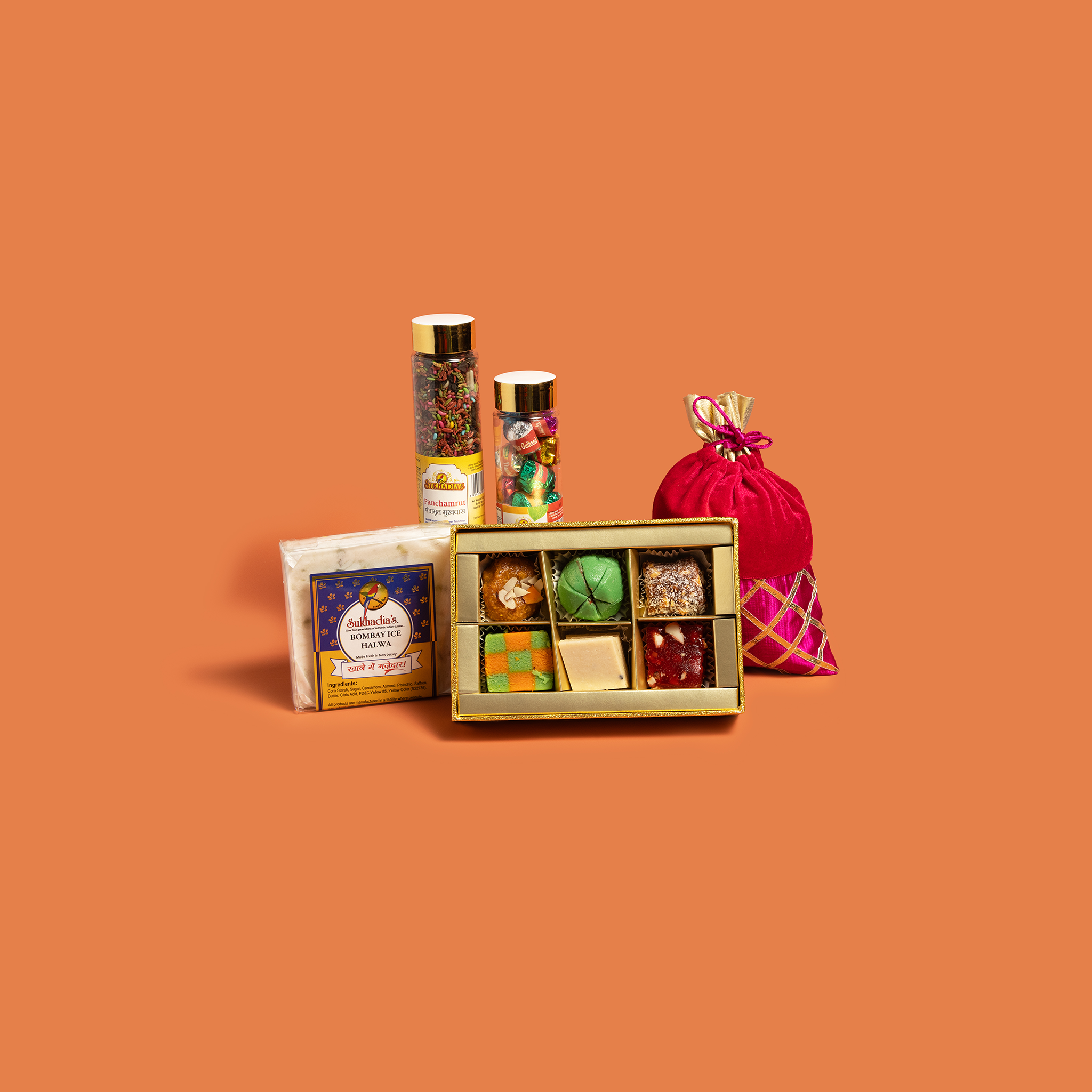 This hamper is part of our all new 2025 Diwali Collection. It contains a variety of products, carefully curated to make gifting special this holiday season. It includes: 8oz bombay halwa, 7oz panchamrut mukhwas, 3.5oz thanda mitha mukhwas, red velvet potli designer filled with 8oz royal mix, and 6pc assorted golden sweets.