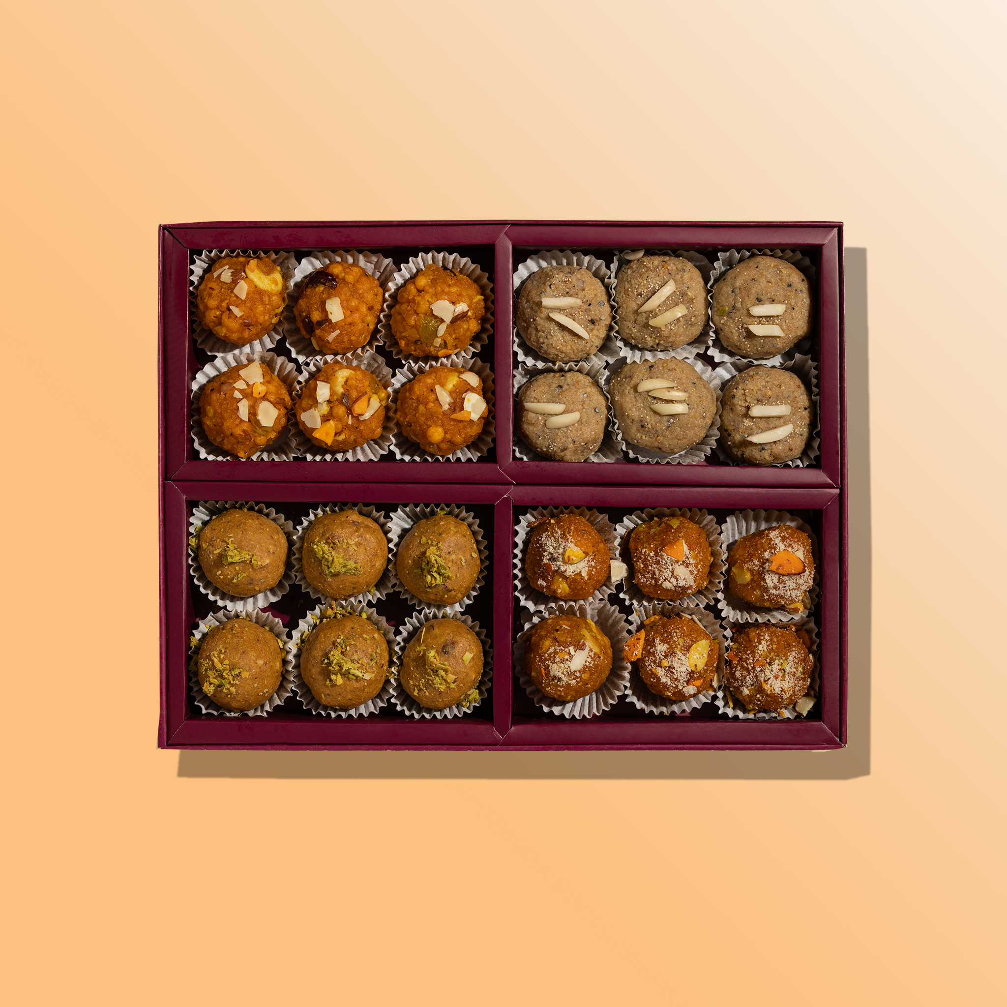 A celebration of tradition — Besan, Motichoor, Bundi & Churma ladoos, artfully brought together in one indulgent collection.