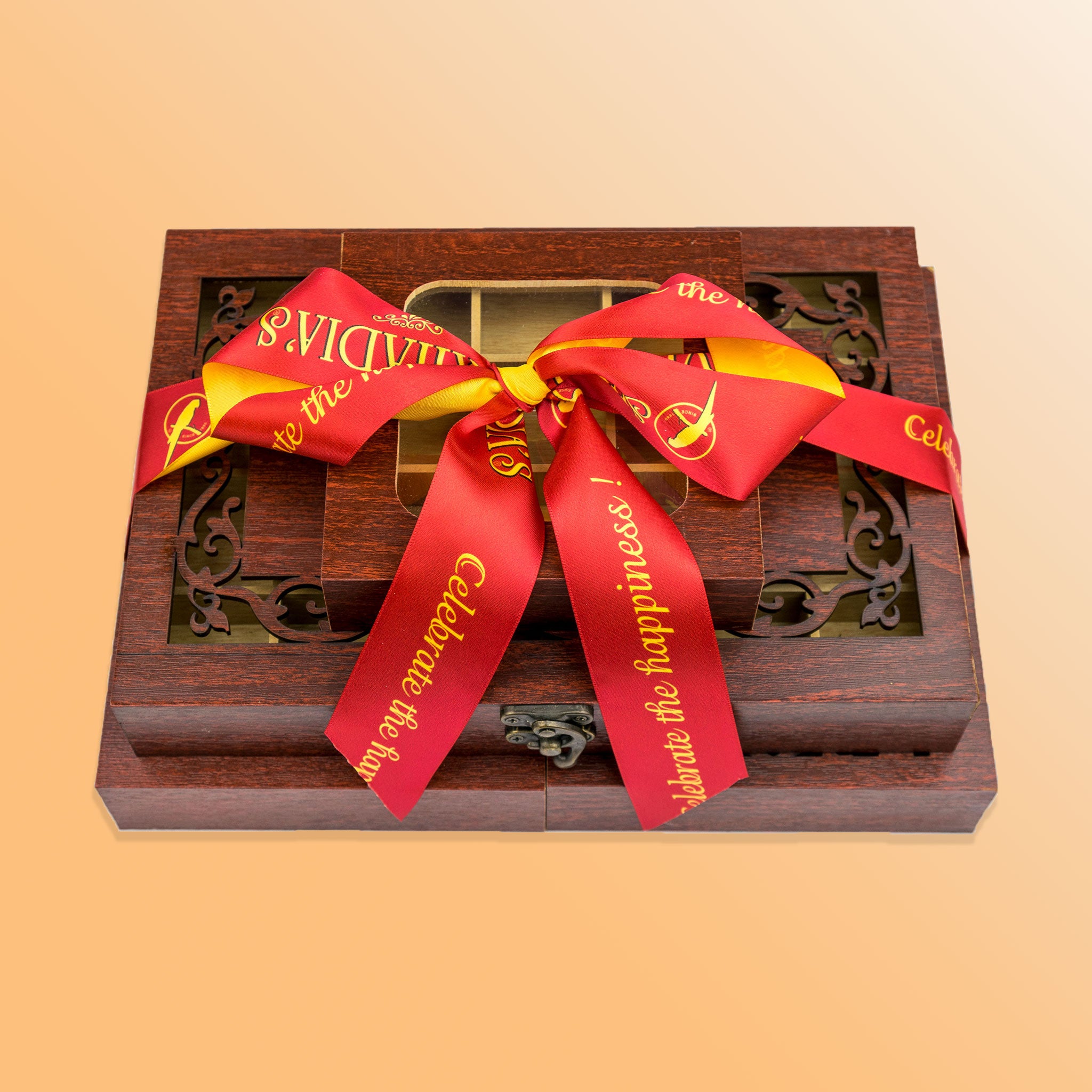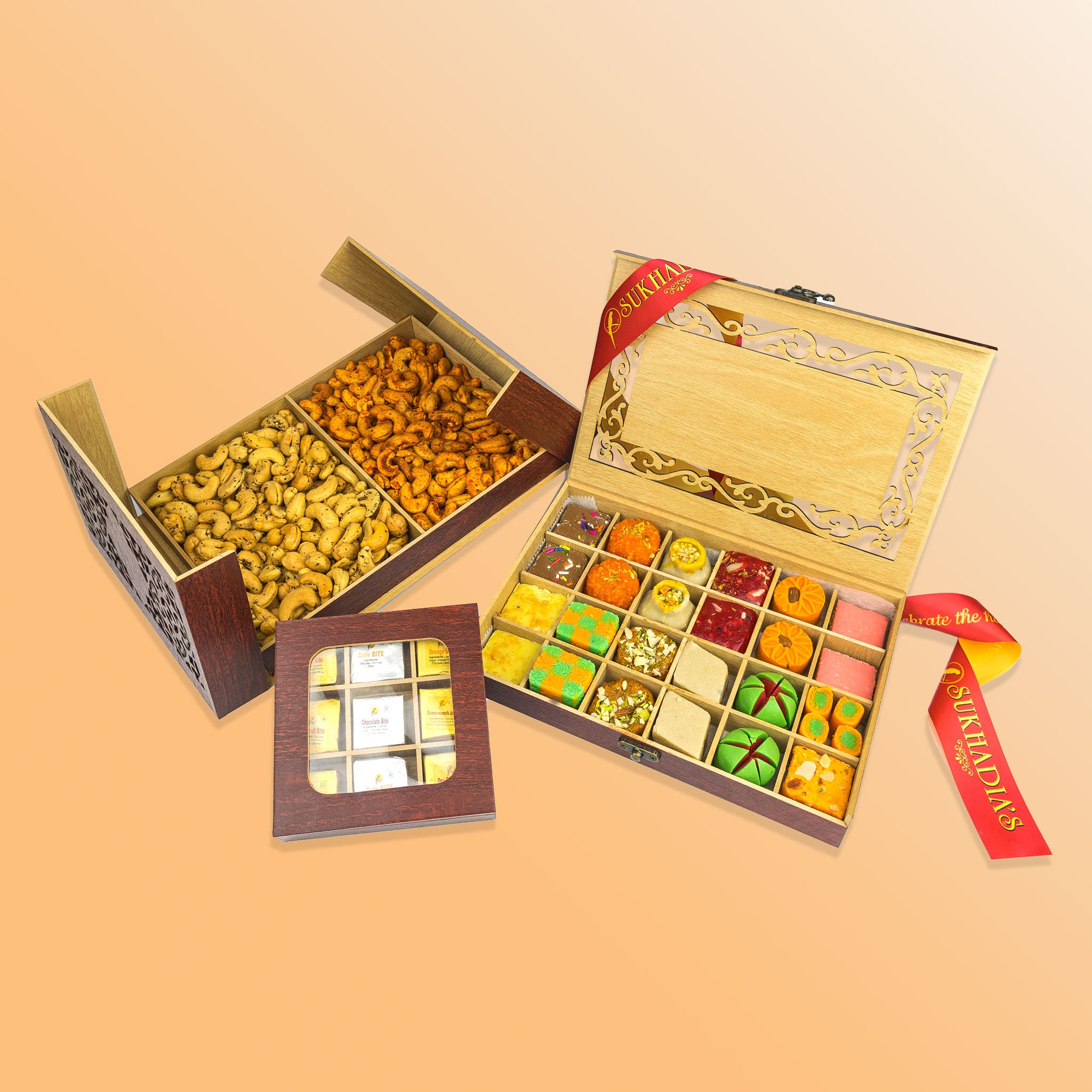 Presented in a unique handcrafted stenciled box, this luxurious gift includes 32 oz of bold red & black pepper cashews, 24 pieces of premium assorted mithai, and 9 pieces of rich dry fruit mewa bites. A perfect balance of sweet and savory, this elegant assortment is ideal for festive gifting, celebrations, or corporate occasions.